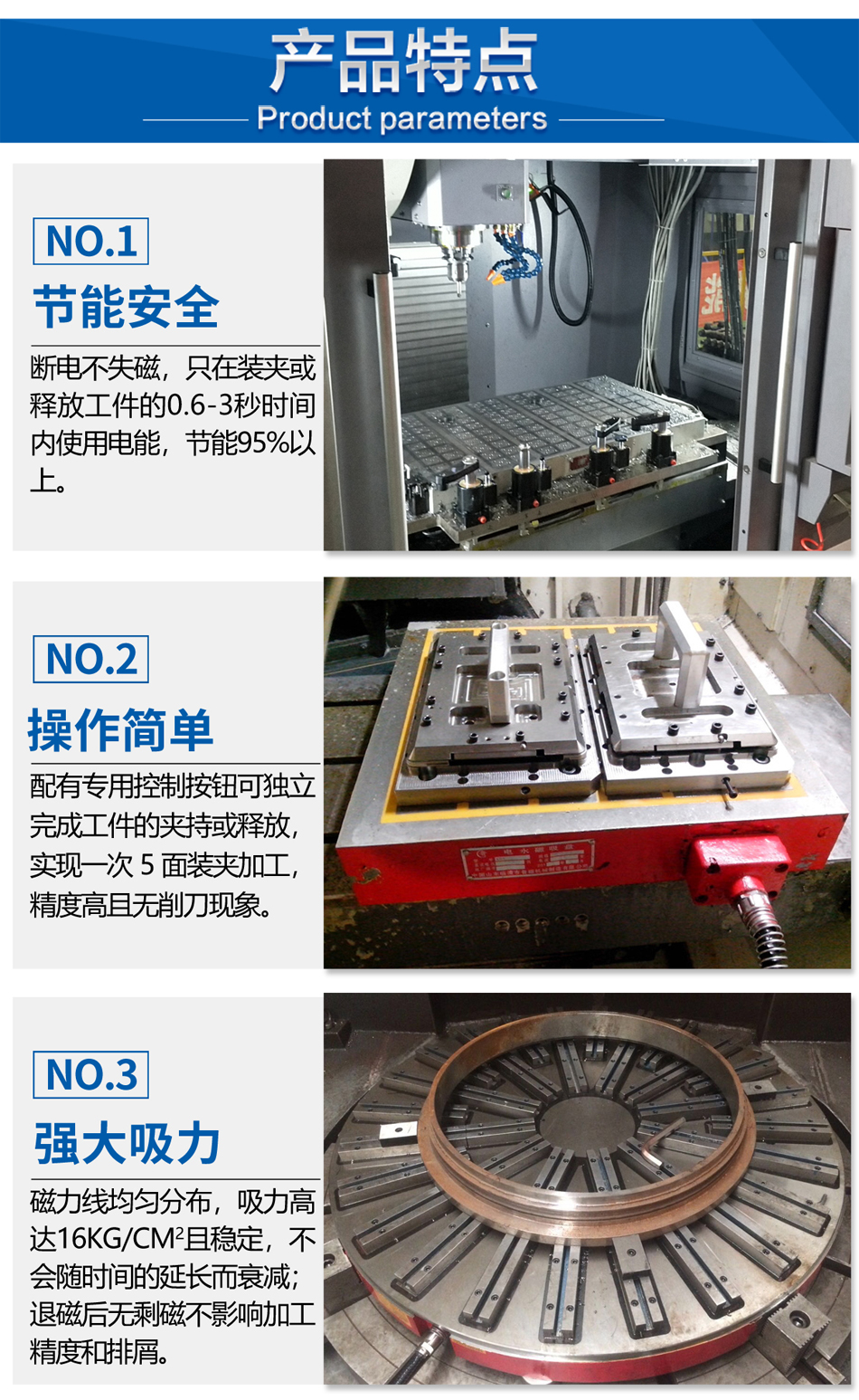 即可牢固吸持住工件,加工過程中無需電源,加工完畢后,在瞬間通電,即可把工件卸下,由于加工過