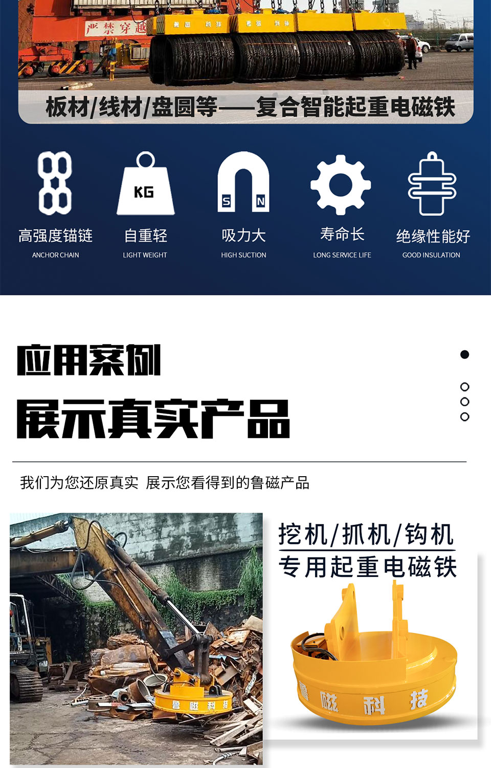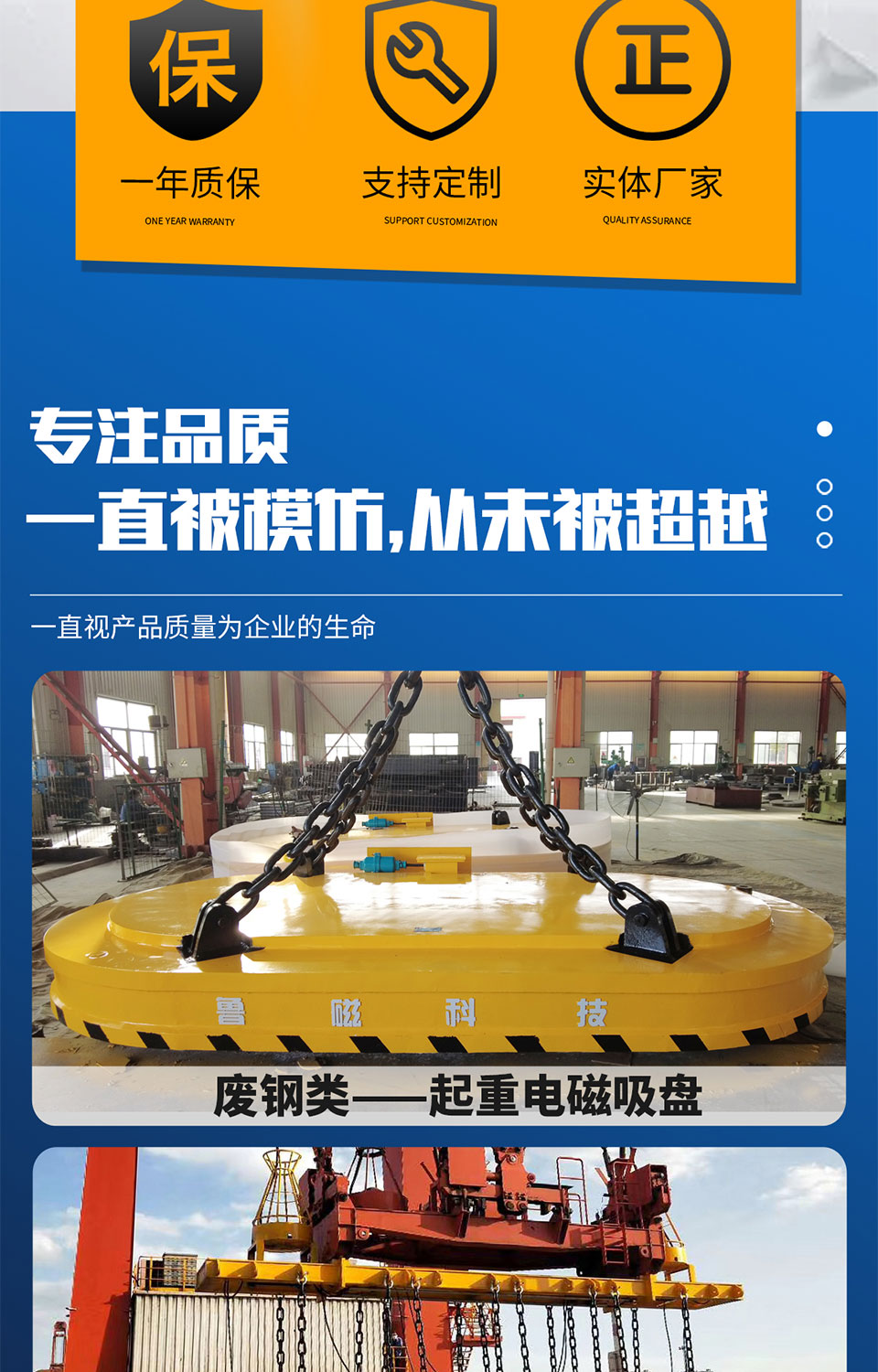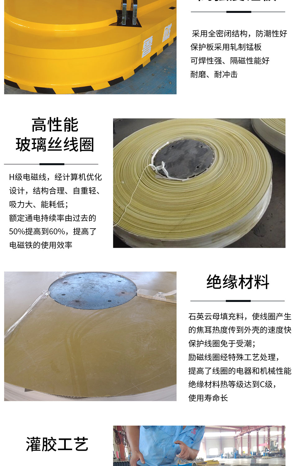 針對鋼鐵廠的大容量煉鋼爐,頻繁裝卸各種輕雜廢料的需要,強磁型起重電磁鐵的吸力高出普通型約30%以上,特別適用于電爐煉鋼上料流程,已廣泛應用于國內各大鋼鐵公司,用戶反映良好。